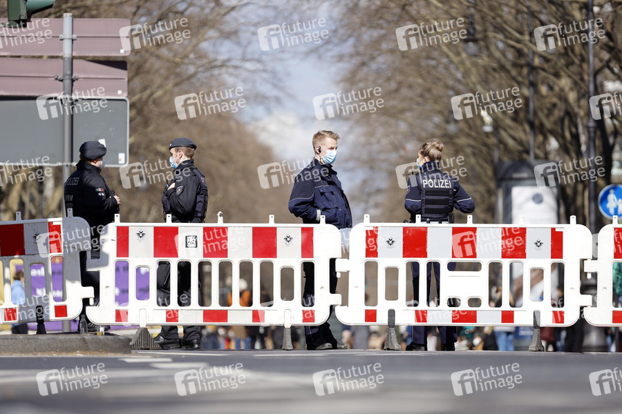 Polizisten am Rande der Kundgebung. Am Freitag finden mehrere Demonstrationen zum globalen Klimastreik unter dem Motto 'Klimagerechtigkeit' von Fridays for Future und weiteren Gruppierungen statt. Köln, 19.03.2021