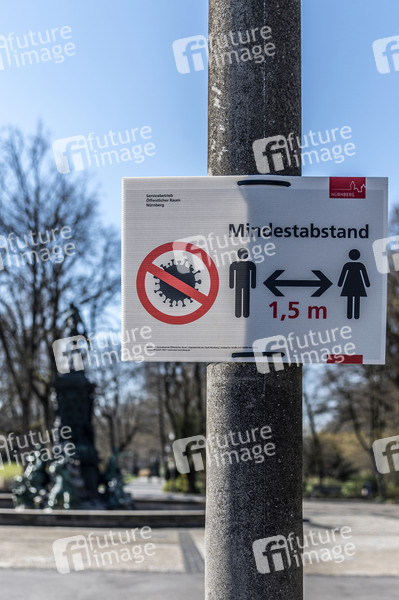 Hinweisschild zum Mindestabstand wegen der Coronakrise im Stadtpark. Nürnberg, 24.03.2020