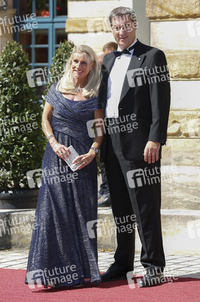 Markus Söder mit Ehefrau Karin Baumüller-Söder bei der Eröffnung der Richard-Wagner-Festspiele 2022 mit der Neuinszenierung von Richard Wagners 'Tristan und Isolde' im Bayreuther Festspielhaus. Bayreuth, 25.07.2022