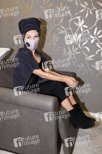 Schauspielerin, Model, Entertainment, Prominenz, Celebrity, Celebrities, Fotoshooting, Photoshooting, Fototermin, Friseur, Frisör, Salon, Haare schneiden, Haarschnitt, Fönen, Waschen, Legen, Corona, Atemschutz, Atemschutzmaske, Virenschutz, Schutzmaske, Maske, Mundschutz, Mund-Schutz, Mundschutzpflicht, Maskenpflicht, Mundschutz-Pflicht, Mund-Nase-Schutz, Mund-Nasen-Schutz, MNS