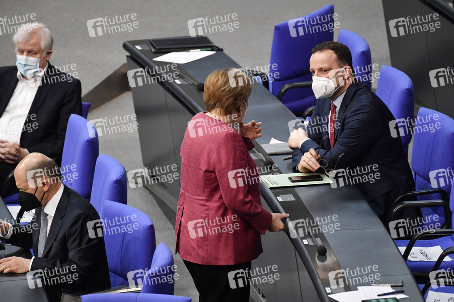 Horst Seehofer, Olaf Scholz, Angela Merkel und Jens Spahn in der 222. Sitzung des Deutschen Bundestages im Reichstagsgebäude. Berlin, 16.04.2021