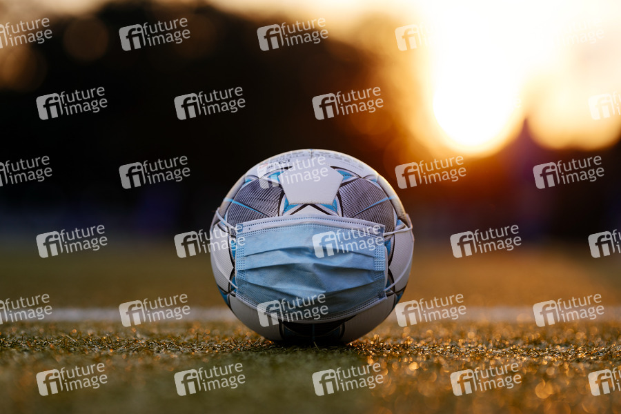 Der offizielle Spielball der Bundesliga Derbystar liegt mit Mundschutz auf einem Fußballplatz. Königsdorf, 02.09.2020
