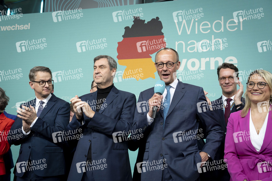 Carsten Linnemann, Markus Söder, Friedrich Merz und Hendrik Wüst beim Wahlabend der CDU im Konrad-Adenauer-Haus. Berlin, 23.02.2025