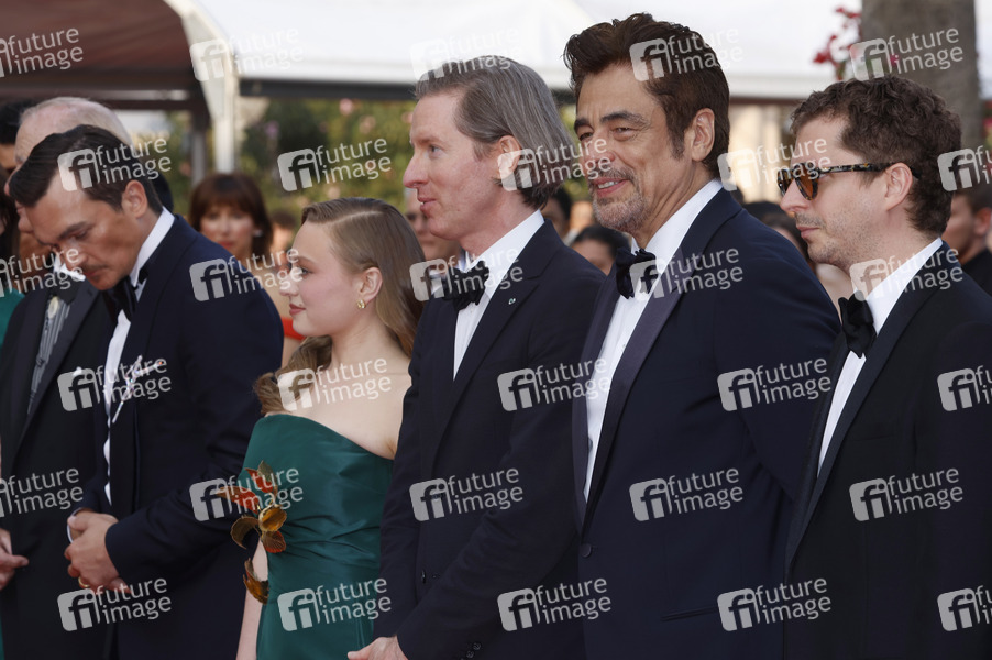 Rupert Friend, Mia Threapleton, Wes Anderson, Benicio del Toro und Michael Cera bei der Premiere des Kinofilms 'The Phoenician Scheme / Der phönizische Meisterstreich' auf dem Festival de Cannes 2025 / 78. Internationale Filmfestspiele von Cannes im Palais des Festivals. Cannes, 18.05.2025