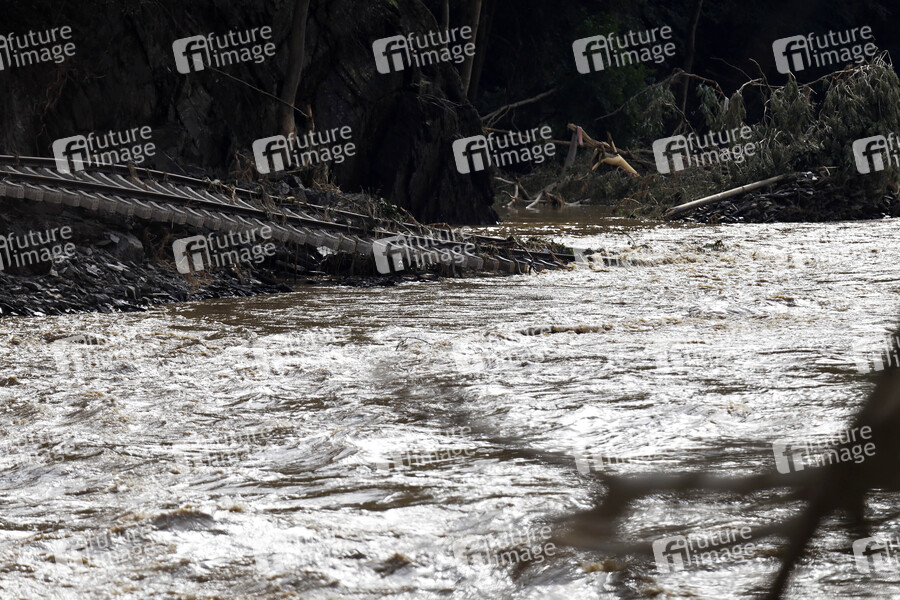 In der Eifel haben heftige Regenfälle und Dauerregen für Überschwemmungen und Überflutungen gesorgt. Im Ahrtal trat der Fluss vielerorts über die Ufer und überschwemmte nicht nur Keller sondern ganze Ortschaften. Im Bild die Eisenbahntrasse zwischen Dernau und Walporzheim, die von den Fluten auf einem Abschnitt einfach mitgerissen wurde. Dernau, 15.07.2021