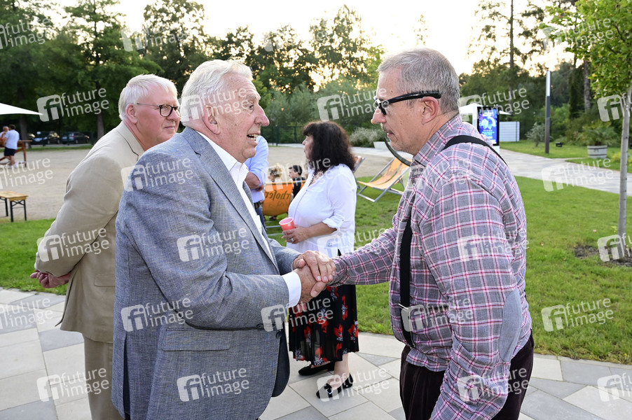 Egon Krenz und Alexander G. Schäfer bei der Premiere des Theaterstücks 'Maxe Baumann - Ferien ohne Ende' während der Beelitzer Festspiele 2025 auf der Freilichtbühne. Beelitz, 14.08.2025