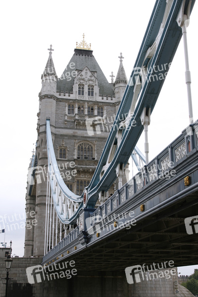 Klappbrücke, Neugotik, 244 Meter lang, Höhe der Brückentürme 65 Meter, die Fahrbahn zwischen den 61 Meter voneinander entfernten Türmen liegt neun Meter über dem Fluss, Fußgängerbrücke in 43 Meter Höhe, die beiden Baskülen können bis zu einem Winkel von 83 Grad hochgeklappt werden, Architekt Horace Jones, erbaut 1886 bis 1894, Themse