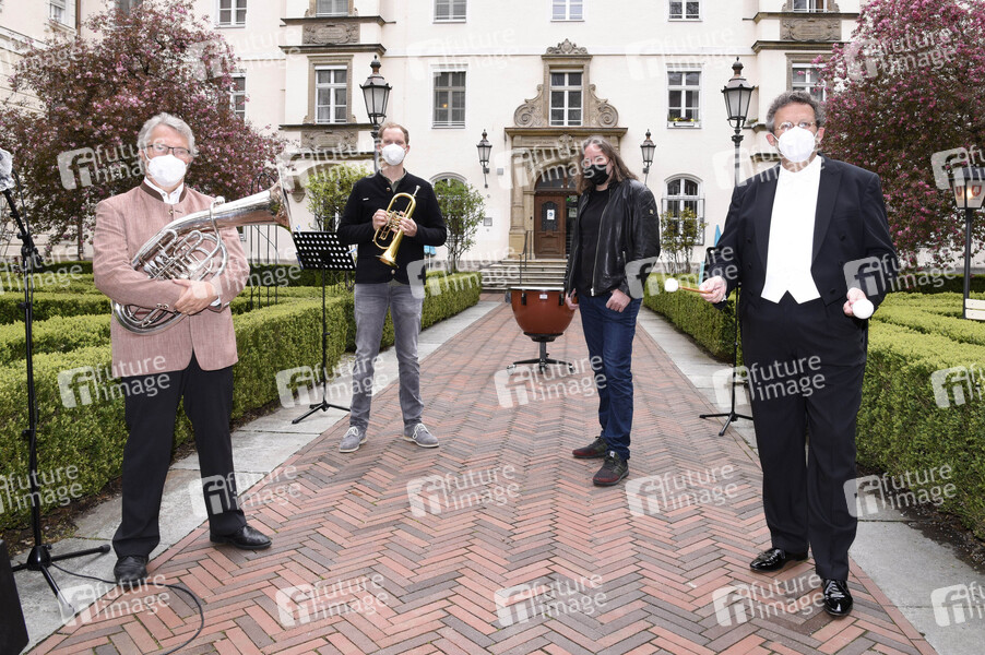 Ernst Hutter, Martin Hutter, Roland Hefter und Mark Mast bei der 'Paukenschlag gegen die Einsamkeit' Konzertveranstaltung der Josef-und-Luise-Kraft-Stiftung für Senioren im Mathildenstift. München, 01.05.2021
