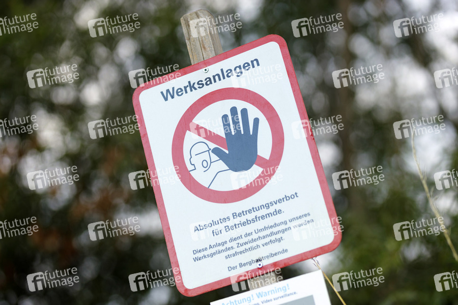 Werksgelände, RWE, Braunkohle, Betretungsverbot, Betreten der Gleise, Hausrecht, Gefahr, Rheinbraun, Braunkohle, Bahnschienen, Bahngleise, Gleisanlagen, Garzweiler, Tagebau, Hausfriedensbruch, Gleisbesetzer, Gleisblockade, Gleisbesetzung, Braunkohlerevier, Gleisbereich, RWE-Gelände, Werkschutz, Kohleausstieg, Demo, Demos, Proteste, draußen bleiben, Halt, Stopp, Warnschild, Hinweisschild, Betriebsgelände, Grenze, Umfriedung, Symbolbild, Symbolfoto