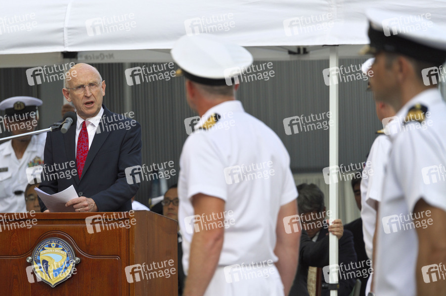 John Healey bei der Ankunft des Flugzeugträgers HMS Prince of Wales R09 am Tokyo International Cruise Terminal. Tokio, 28.08.2025