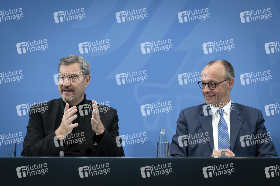 Markus Söder und Friedrich Merz beim Pressestatement zu den Ergebnissen der Beratungen vom Koalitionsausschuss im Bundeskanzleramt. Berlin, 28.11.2025