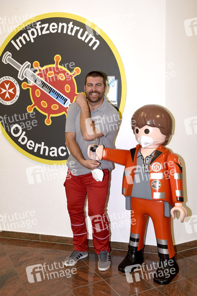 Schauspieler und Kabarettist Franz Josef Strohmeier arbeitet für die Johanniter im Impfzentrum der Johanniter. Er ist auch berechtigt zu Impfen. Oberhaching, 06.06.2021