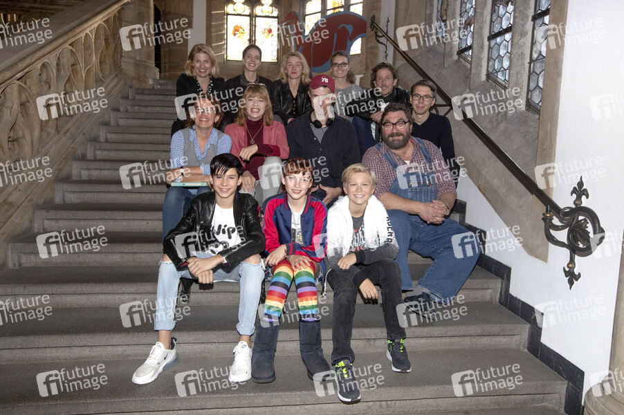 Hintere Reihe: Die Produzentinnen Alexandra Kordes (Kordes & Kordes Film), Cosima von Spreti (TMG), Meike Kordes (Kordes & Kordes Film), Laura Clever (Clever Productions) sowie VFX-Verantwortlicher Christian Sommer (Trixter). Mittlere Reihe: Margit Auer (Buchautorin), Viola M.J. Schmidt (Drehbuchautorin), Gregor Schnitzler (Regisseur), Heiko Pinkowski ('Wondraschek'), Lars Nitschke (FFF Bayern, Film Commission Bayern). Vordere Reihe: Loris Sichrovsky ('Jo'), Emilia Maier ('Ida'), Leonard Conrads ('Benni”) beim Fototermin am Set des Kinofilms 'Die Schule der magischen Tiere' im Neuen Rathaus am Marienplatz. München, 11.10.2019