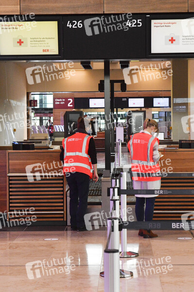 Rundgang durch den öffentlichen Bereich des Terminals 1 mit Check-in-Halle und Besucherterrasse auf dem Flughafen Berlin Brandenburg. Schönefeld, 28.10.2020