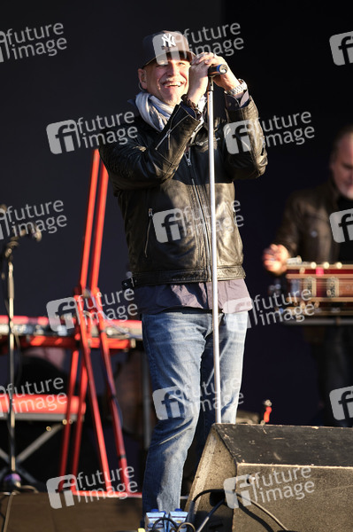Kai Wingenfelder von Fury in the Slaughterhouse live beim Autokultur-Konzert auf dem Schützenplatz. Die Besucher verfolgen unter Berücksichtigung klarer Hygiene-Vorschriften während der Corona-Krise den Auftritt aus dem Auto. Hannover, 14.05.2020