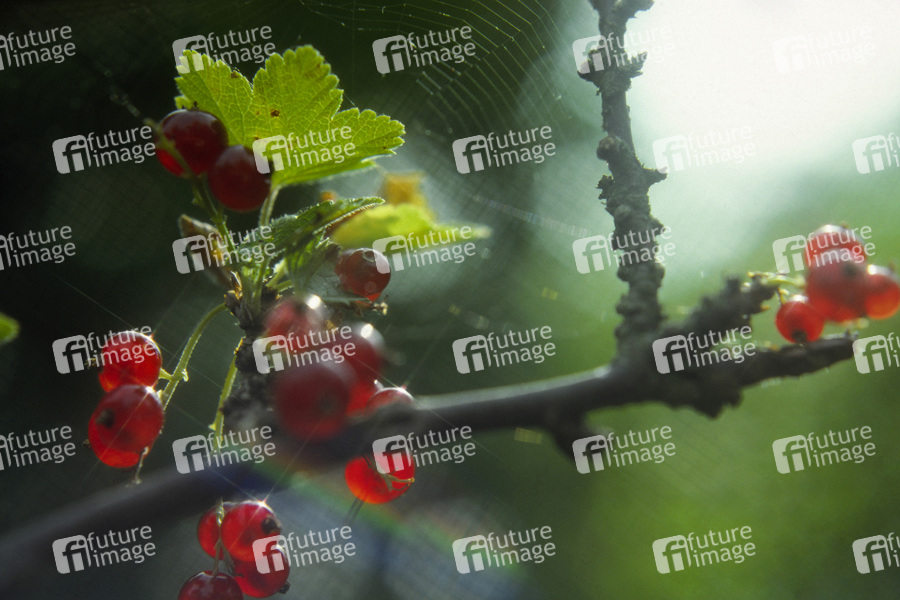 Frucht, Fruechte, Beeren, Johannisbeeren, Gegenlicht, Spinnennetz, Garten, Freizeit, Sommer, Markt, Gaertnern, Ernte, Kuchen, Dessert, rote Fruechte, Rot