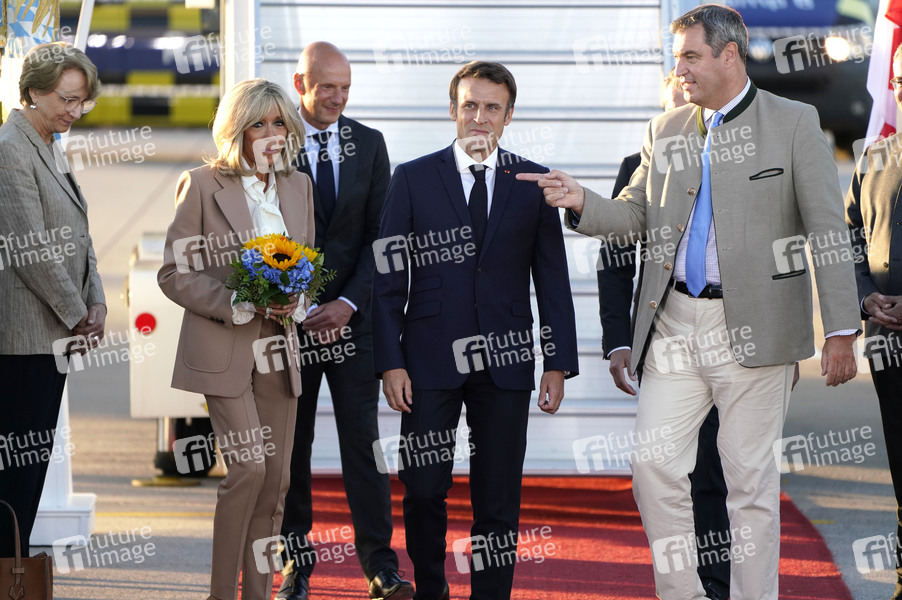 Emmanuel Macron mit Ehefrau Brigitte Macron und Markus Söder bei der Ankunft von Präsident Macron zum G7-Gipfel am Flughafen München Franz Josef Strauß. München, 25.06.2022