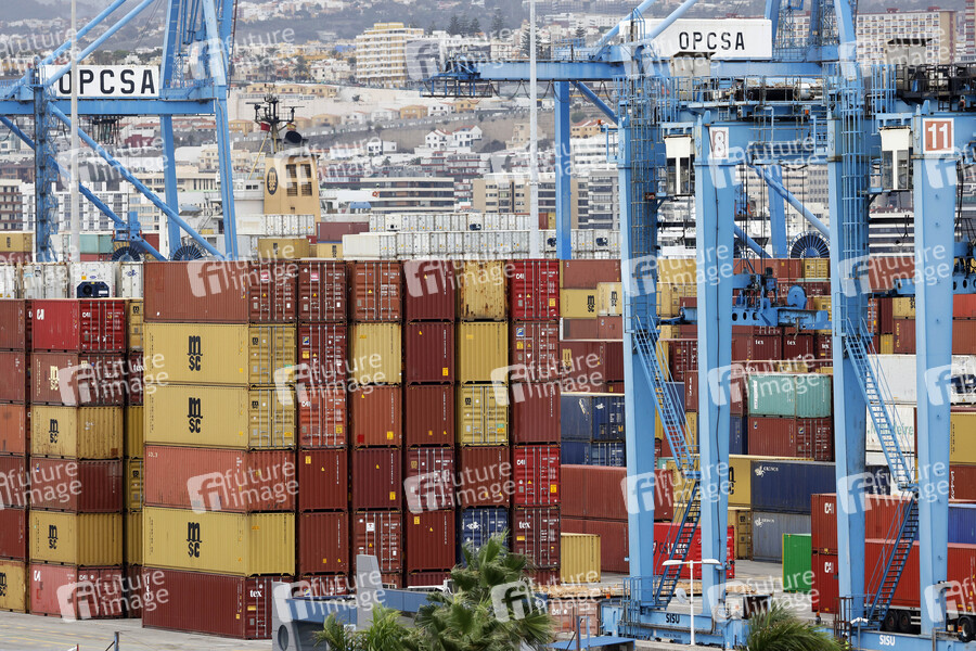 Container, Schiffscontainer, Ware, Waren, Bruttoregistertonne, Bruttoregistertonnen, Warenverkehr, Warenaustausch, Welthandel, Handel, Wirtschaft, Makroökonomie, Schiffsfracht, Fracht, löschen, Einfuhr, Ausfuhr, Import, Export, Zoll, Zölle, Strafzölle, Lieferkette, Lieferketten, Hafen, Handelsroute, Handelsrouten, Importe, Exporte, Exportüberschuss, Importüberschuss, Umschlagshafen, kanarische Inseln, Kanaren, Gran Canaria, ISO-Container, High Cube, Seecontainer, Logistik, Containerkrise, Transport, Transportkosten, globaler Markt, Weltwirtschaft, Hafen, Symbolbild, Symbolfoto