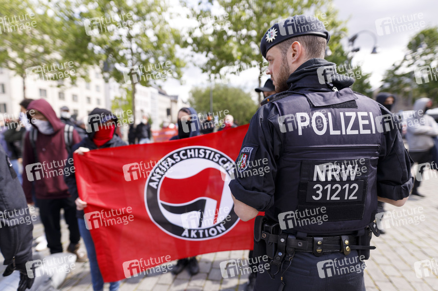 Linke, Linksautonome, Antifa, Antifaschisten, Demo, Demonstranten, Demonstration, Demonstrationszug, Erster Mai, Feiertag, Maidemo, Mai-Demo, Politik, Protestmarsch, Protestplakat, Protestzug, Tag der Arbeit, Polizei, Polizeieinsatz, Polizeibeamte, Polizeipräsenz, Polizist, Polizisten, Polizistin, Sicherheitskräfte, Corona, Sars-CoV-2, Covid-19, Coronavirus, Coronaviren, Corona-Virus, Coronakrise, Corona-Krise, Corona-Pandemie, Coronamaßnahmen, Corona-Schutz, flatten the curve, Ausnahmesituation, Kontaktverbot, Versammlungsverbot, Mindestabstand, Social Distancing, Kontakt verboten, Ausgangsbeschränkung, Abstand, Abstandhalten, Abstandsregel, Abstandsregeln, Allgemeinverfügung