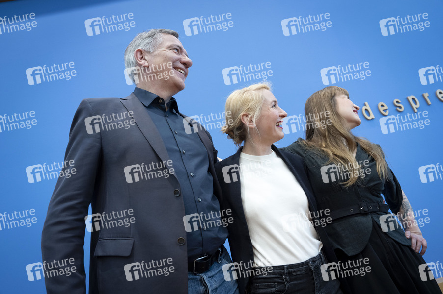 Jan van Aken, Ines Schwerdtner und Heidi Reichinnek bei der Bundespressekonferenz Die Linke - Zu den Bundestagswahlen im Haus der Bundespressekonferenz. Berlin, 24.02.2025