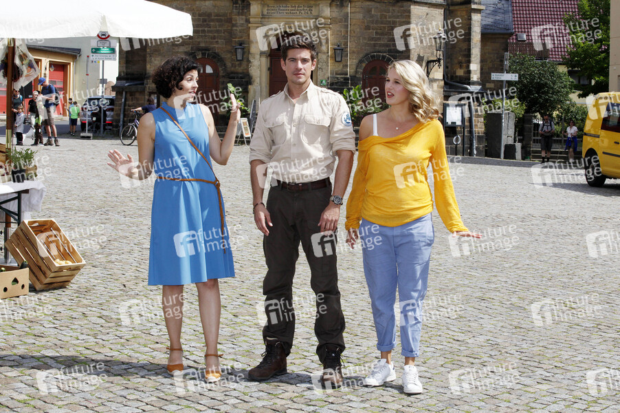 Liza Tzschirner, Philipp Danne und Eva-Maria Grein von Friedl am Set des ARD-Fernsehfilms 'Der Ranger - Paradies Heimat' auf dem Marktplatz. Stadt Wehlen, 14.08.2019