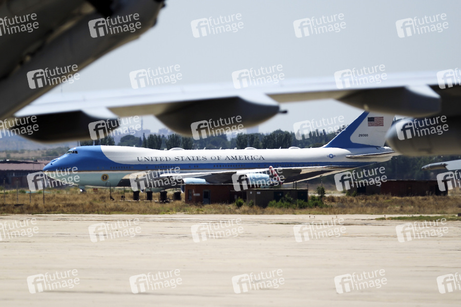 Ankunft, Glughafen, Airport, Militärflughafen, Base Aérea de Torrejón de Ardoz, Gipfeltreffen der NATO-Staaten, NATO-Gipel, Verteidigungsbündnis, Flugzeug, Boeing 747-200B, Präsident der Vereinigten Staaten, Demokratische Partei