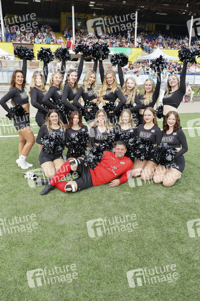 Tim Mälzer und die HSV Cheerleader beim Benefiz-Fußballspiel 'Kicken mit Herz' 2024 zu Gunsten des Herzzentrums des UKE im Stadion des SC Victoria. Hamburg, 08.09.2024