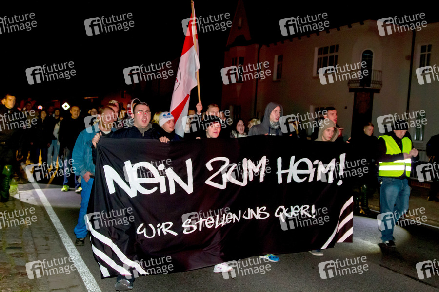 Demonstration von 150-200 Neonazis gegen das geplante Asylbewerberheim in Pätz. Geplant war ein Fackelmarsch, aber die Fackeln wurden von der Polizei verboten und beschlagnahmt. Pätz bei Bestensee, 25.10.2013