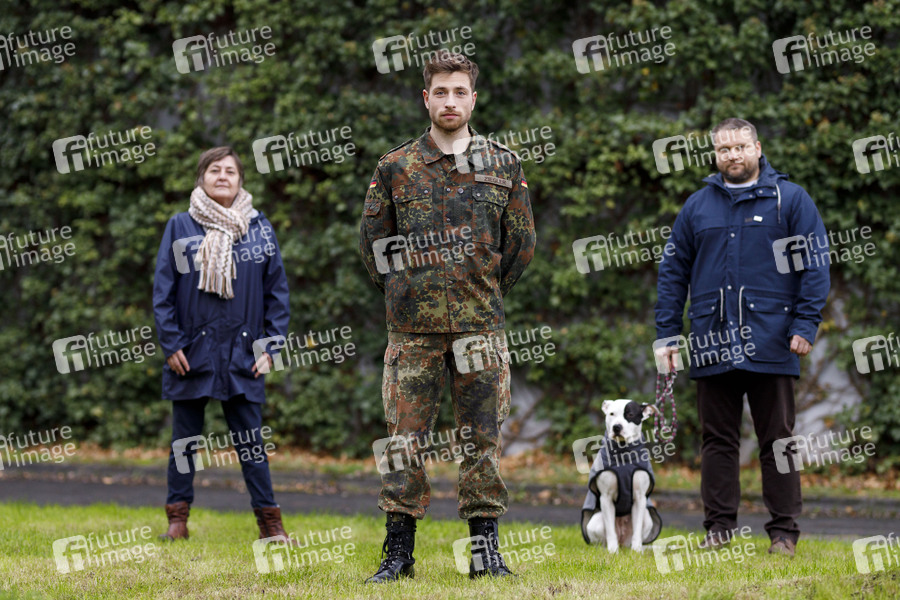 Cäcilie Breithecker, Dominik Flade und Detlef Förster mit Hund Bella beim Fototermin am Set der RTL TV-Serie 'Alles was zählt' in den MMC-Studios in Ossendorf. Köln, 03.12.2020