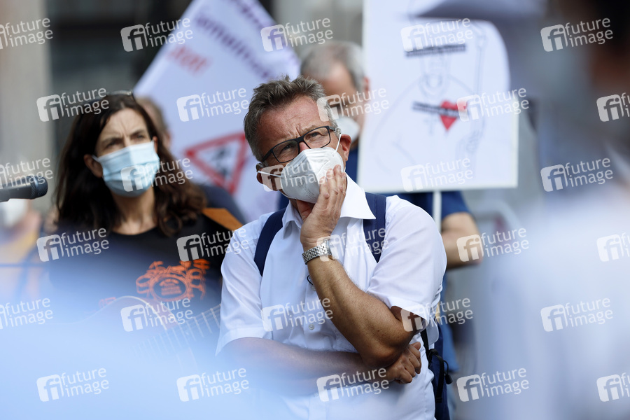 Klaus Koltermann bei einer Kundgebung auf dem Börsenplatz, bei der Gläubige aus dem Erzbistum Köln und Aktivisten der Bewegung Maria 2.0 das Verhalten der Kirche und Erzbischof Rainer Maria Kardinal Woelki bei der Aufarbeitung des Missbrauchskandal kritisieren. Am Nachmittag trifft auch eine Pilgergruppe von Pfarrer Klaus Koltermann aus Dormagen Nievenheim mit 60 Christen nach 40 Km Fußmarsch unter dme Motto 'Aufbruch nach Köln' auf dem Börsenplatz ein. Koltermann hat sich als einziger Pfarrer in Deutschland für den Rücktritt von Kardinal Woelki ausgesprochen. Köln, 12.06.2021