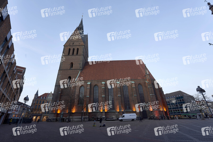 Beleuchtete Marktkirche Hannover - Seit 2016 wird am internationalen Aktionstag gegen Gewalt an Frauen und Mädchen auch ein sichtbares Zeichen gesetzt. Gebäude auf der ganzen Welt erstrahlen am 'Orange Day' in orangem Licht. Hannover, 25.11.2020