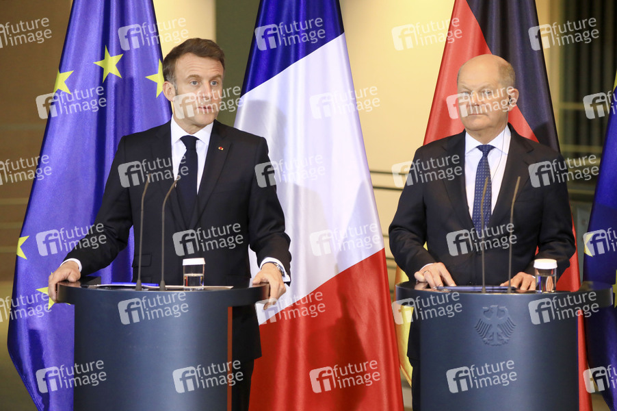 Emmanuel Macron und Olaf Scholz beim Empfang des Staatspräsidenten der Französischen Republik zu einem gemeinsamen Gespräch mit anschließendem Pressestatement im Bundeskanzleramt. Berlin, 18.03.2025