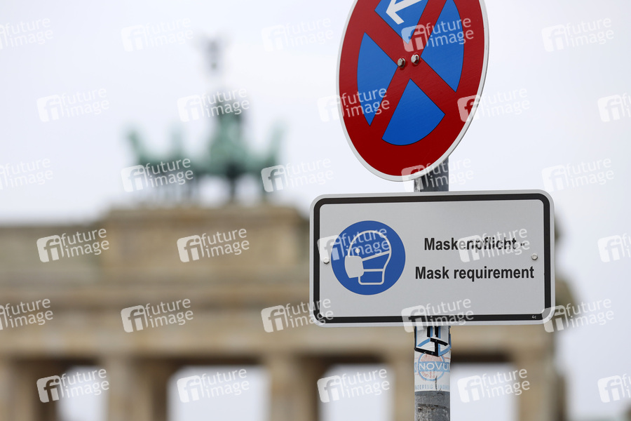 Harter Lockdown zu Ostern: Stimmen werden laut nach einem harten und konsequenten Lockdown. Es seien schärfere Corona-Maßnahmen nötig, um die Pandemie einzudämmen, meinen Ärzte wie Weltärztepräsident Montgomery. Im Bild ein Schild, welches auf Maskenpflicht am Pariser Platz vor dem Brandenburger Tor hinweist. (Themenbild, Symbolbild) Berlin, 31.01.2021