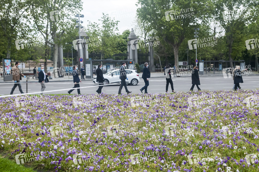 Madrids Bürgermeister Jose Luis Martinez-Almeida mit Vertretern der Gemeinde bei einer Schweigeminute für die Covid-19 Opfer an der Puerta de Alcalá am 40. Tag seit Verhängung des Ausnahmezustands durch die spanische Regierung wegen der Coronakrise. Madrid, 23.04.2020