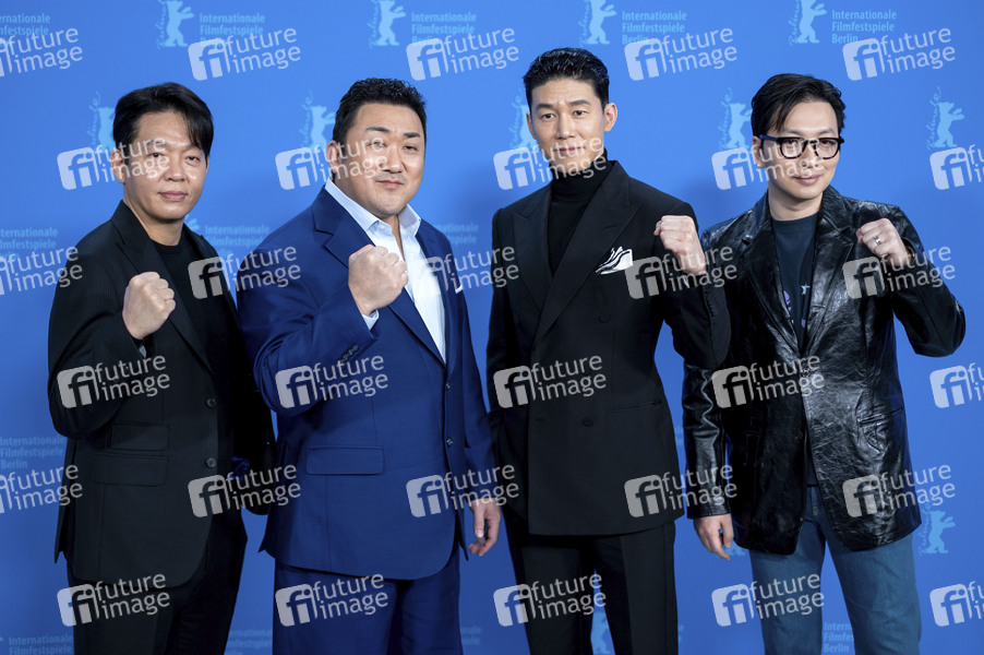 Park Ji-hwan, Heo Myeong-haeng, Kim Mu-yeol und Lee Dong-hwi beim Photocall zum Kinofilm 'Beom-Joe-do-si 4 / Beomjoedosi4 / The Roundup: Punishment' auf der Berlinale 2024 / 74. Internationale Filmfestspiele Berlin im Hotel Grand Hyatt. Berlin, 23.02.2024