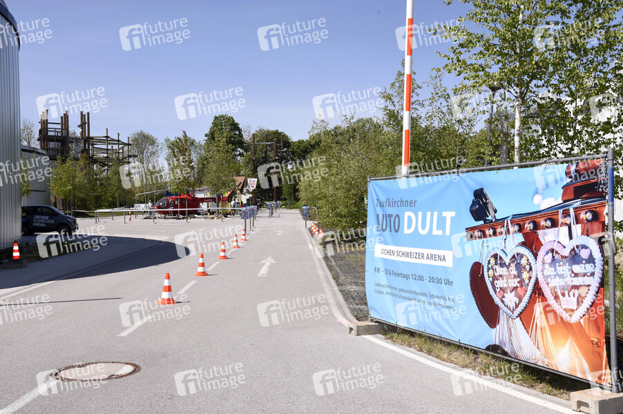 Das Volksfest Taufkirchner Auto Dult auf dem Gelände der Jochen Schweizer Arena ist in Corona-Zeiten an folgende Bedingungen geknüpft: Abholung nur als Drive-In, Bestellung am Auto, Mundschutz tragen und Verzehr nur im Auto oder Zuhause erlaubt. Taufkirchen, 08.05.2020