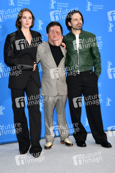 Renate Reinsve, Adam Pearson und Sebastian Stan beim Photocall zum Kinofilm 'A Different Man' auf der Berlinale 2024 / 74. Internationale Filmfestspiele Berlin im Hotel Grand Hyatt. Berlin, 16.02.2024