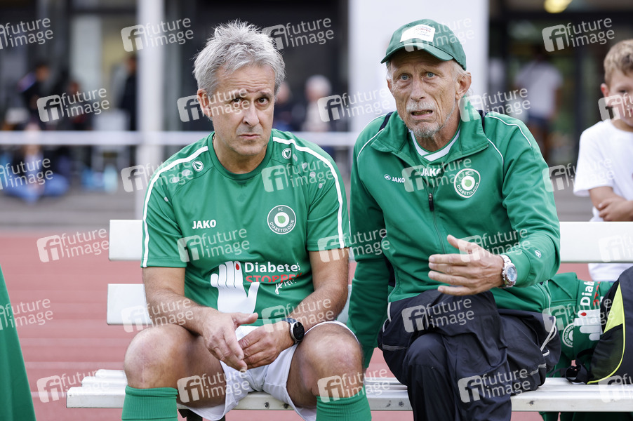Pierre Littbarski und Christoph Daum beim Fußballspiel FC Bundestag vs. FC Diabetologie im Friedrich-Ludwig-Jahn-Sportpark. Berlin, 06.09.2022