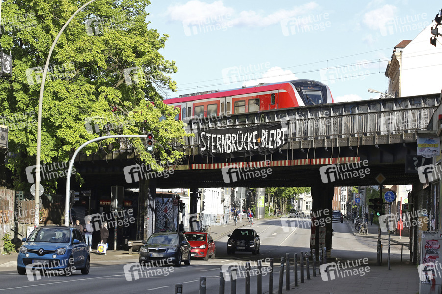 Ein Transparent 'Sternbrücke bleibt' als Zeichen des Protests gegen den geplanten Abriss und Neubau der Sternbrücke in der Sternschanze. Hamburg, 05.05.2020