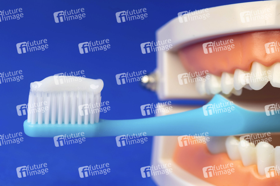 Zahnmodell, Gebissmodel, Zähne, Gebiss, Zahnbürste, Zahncreme, Zahnschmelz, Mundhygiene, fluoridhaltige Zahnpasta, Karies, Zahnpulver, Zahnbelag, Zahnarzt, Zahnfleisch, Zahnfleischerkrankung, Mundspülung, Mundwasser, Putztechnik, Zahngesundheit, Kalzium, Zahnstein, Zahnbelag, Mundgeruch, Smbolbild, Themenbild