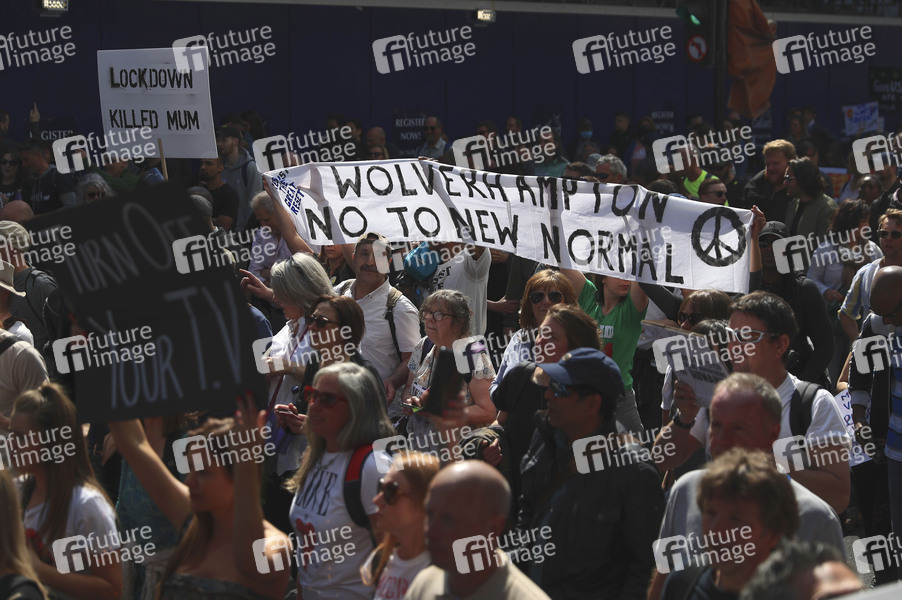 Mehrere tausend Menschen protestieren gegen die Corona-Maßnahmen und ziehen trotz geltender Beschränkungen für Massenversammlungen durch die britische Hauptstadt. Masken trägt dabei so gut wie niemand, dafür aber Protestschilder mit Aufschriften, die sich unter anderem gegen Corona-Pässe und -Tests richteten. London, 24.04.2021