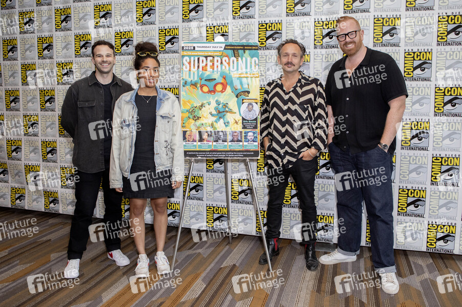 Zach Robinson, Amanda Jones, Will Bates und Phil McCowan beim Photocall zum Thema '17th Annual Behind the Music - Supersonic' auf der San Diego Comic-Con International 2025 im Hilton Bayfront Hotel. San Diego, 24.07.2025