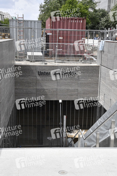 Einblick in den neuen U-Bahnhof Unter den Linden der Linie U5 von der Mittelinsel der Kreuzung Friedrichstraße / Unter den Linden. Der U-Bahnhof ist fast fertig. Die Containerburgen und die festen Bauzäune wurden zurückgebaut. Berlin, 24.05.2020