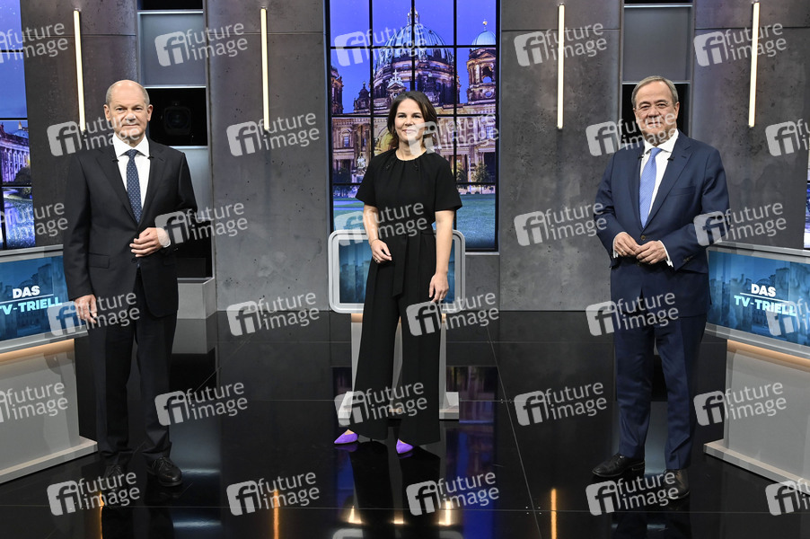 Olaf Scholz, Annalena Baerbock und Armin Laschet beim 'Triell - Dreikampf ums Kanzleramt' von ProSieben, SAT.1 und Kabel Eins mit den Kanzlerkandidaten im Studio Berlin-Adlershof. Berlin, 19.09.2021