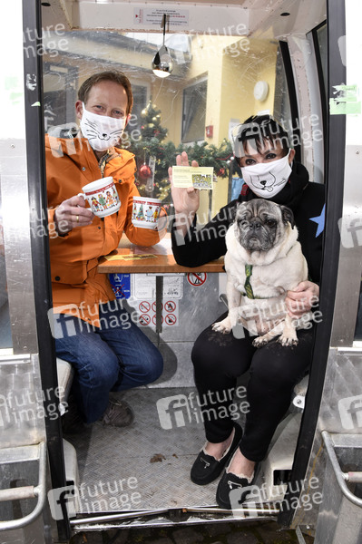 Axel Bansemir und Uschi Ackermann mit Hund Willy beim Fototermin zur Masken- und Gondelspende in der Medizinischen Kleintierklinik der Ludwig-Maximilians-Universität (LMU). Frauchen und Herrchen dürfen aufgrund der aktuellen Situation ihr erkranktes Tier nicht mit in die Klinik begleiten. Sie müssen draußen bleiben! Damit sie nicht frieren, stellt MilchHäusl-Besitzer Axel Bansemir der Medizinischen Kleintierklinik zwei seiner beheizbaren Ski-Gondeln gratis über die Wintermonate zur Verfügung. Uschi Ackermann hat ihren Mops Willi in der Medizinischen Kleintierklinik in Behandlung und testet die kuschelig warmen Gondeln mit einer Tasse Tee. Uschi Ackermann trägt eine Maske, mit cooler Hunde-Illu und dem Klinik-Logo. Sie hat der Klinik 100 tierisch bedruckte Stoffmasken gespendet. München, 21.12.2020