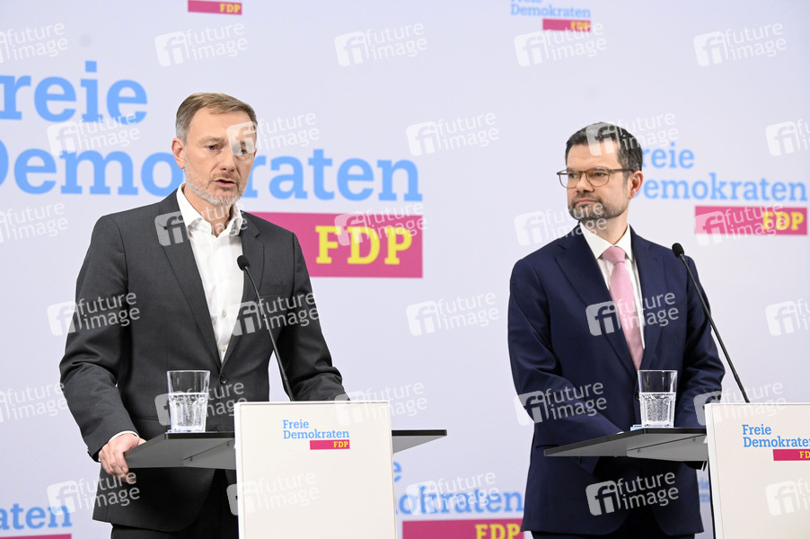 Christian Lindner und Marco Buschmann bei der Presseskonferenz der FDP zur Vorstellung des neuen Generalsekretärs Marco Buschmann im Hans-Dietrich-Genscher-Haus. Berlin, 02.12.2024