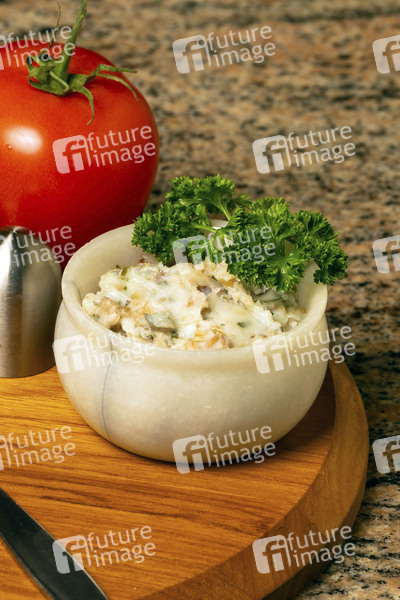 Schmalztopf mit Brot, Gurke, Tomate und Petersilie