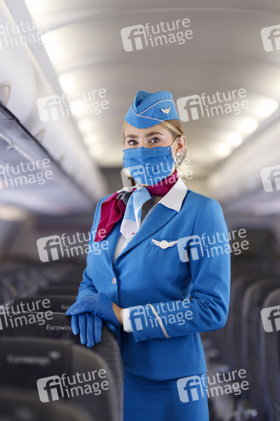 Stewardess von Eurowings bei der Vorstellung des Sicherheitskonzepts am Flughafen Köln Bonn während der Coronakrise 'Sicher in Corona Zeiten'. Köln, 27.05.2020