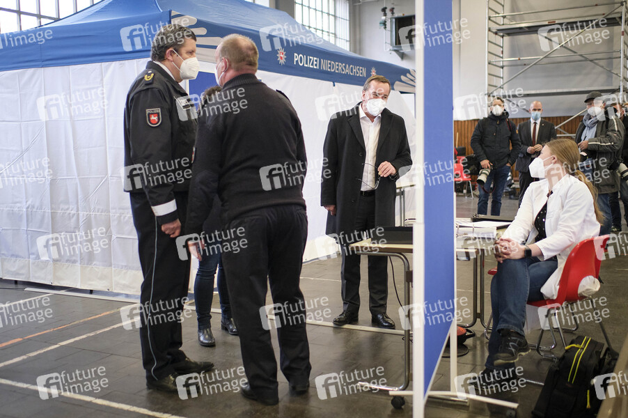 Boris Pistorius beim Start der Impfungen für Einsatzkräfte aus den geschlossenen Einsatzeinheiten der Zentralen Polizeidirektion Niedersachsen (ZPD) in der Tannenbergallee. Hannover, 04.03.2021