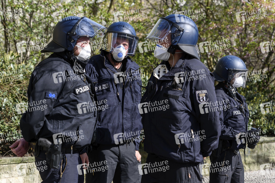Polizisten mit Mundschutz beim Protest der Kommunikationsstelle Demokratischer Widerstand Berlin gegen die Einschränkung der Grundrechte durch Eindämmungsverordnung der COVID-19-Pandemie im Rahmen des Infektionsschutzes vor der Berliner Volksbühne. Die Demonstranten protestieren gegen die Einschränkung des Versammlungsrechts durch das Kontaktverbot und relativieren die Gefahr duch das Corona-Virus. Auch diese 3. 'Hygienedemo' wurde durch die Polizei aufgelöst. Alle Personen wurden vorläfig festgenommen. An dem Protest beteiligten sich eine Reihe von Verschwörungstheoretikern. Berlin, 11.04.2020
